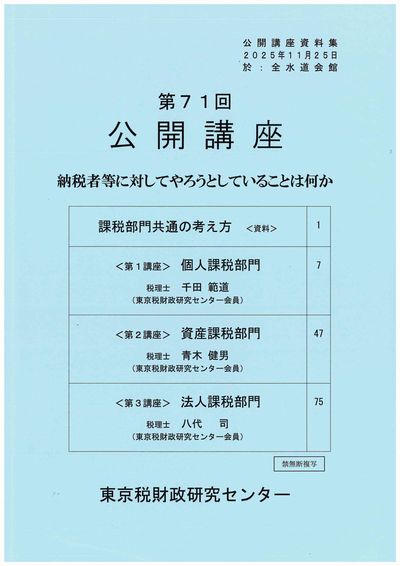 研究センターは会議終了を見計って開示請求し、その開示資料をもとに今回の講座を開いている。総数136ページの「公開講座資料集」には、東京国税局の統括官会議資料がふんだんに収録されていて、大変目を引く。